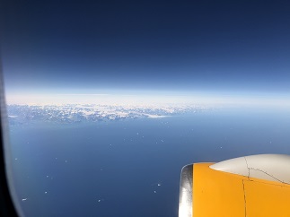64) Greenland, Iceland, August 11, 2021 - Our final day was pretty basic. Up early, breakfast, packing, lunch and then our taxi ride to the airport for our flight out. Nothing worth writing about. However, as we flew west we went directly over the southern edge of Greenland. It was a cloudless day so we had fantastic views of the massive landmass that is Greenland. Sadly, we also had a bird's eye view of the thousands of icebergs fanning out from the (rapidly) melting glaciers. A beautiful, if sad, sight to end our incredible vacation to Iceland.