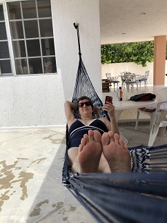 5) Progresso, Yucatan, Mexico, May 15, 2021 - Jonna managed to survive yesterday's water soaking so this morning she was moved into the stringy torture chair to see if hanging in the breeze for a few hours will break her. She may even be forced to drink tropical fruit juices and listen to podcasts. The discomfort will not end until she becomes cooperative.