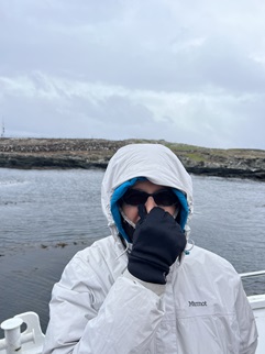 100) Alicia Island, Beagle Channel, Ushuaia, Argentina, November 18, 2023 - Today, the penultimate day of our trip, was a busy one so we had to get an early start. We got up at 6:45 in order to eat breakfast at the hotel as soon as they laid out the sparse selection of food. As soon as we ate, Jamie and I walked down the hill in the mixed sleet/rain to the laundromat where we had dropped off our dirty clothes yesterday. As they had promised they had our clean clothes ready for pickup at 8:30 which gave is time to carry them back up the hill, leave them at the hotel and to pick up Jonna. Then it was down the hill again to go to the tourist port. We had two back-to-back excursions scheduled for today so we headed straight to the kiosk of Patagonia Adventure Explorers the operator of our morning tour. PAE operates small boat tours in the Beagle Channel. We boarded the Telienka along with 17 other passengers and 3 crew for a four hour cruise. The clouds that were dropping snow or sleet or rain (it changed minute to minute) were low enough that they covered the mountains and even the higher parts of Ushuaia. However, as we sailed out into the channel the precipitation stopped and we could make out the faintest glimmer of the sun behind the clouds. Our first stop was a small island, Alicia Island, that is home to huge colony of Imperial Cormorants. At first glance it looks like a penguin colony because the cormorants have similar black and white markings. The birds were packed side-by-side on the mostly barren rocks. It was quite a sight but it was even more quite a smell.