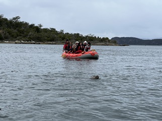 114) Río Lapataia, Tierra del Fuego National Park, Ushuaia, Argentina, November 19, 2023 - We were spotting various birds as we paddled but the big wildlife encounter was right where two rivers converge and become the bay. This is an area where juvenile male sea-lions hang out during the breading season - basically a place they can eat, play, learn to fight and stay well clear of the adult males who are beating the crap out of each other trying to protect or steal females from each other’s harems. When we reached this area there were a few sea-lions swimming around and they were curious about the lumbering red rafts floating through their playground. They would surface just a few feet away and look up at us or even swim underneath the raft to pop up on the other side. We spent about 15 minutes watching them. We finished the paddle and pulled the rafts out of the water at kilometer 0 of Ruta 3. The end (or the beginning as the Argentinians claim) of the Pan-American highway the other end of which is in Prudhoe Bay, Alaska. There is even an official Fin Del Mundo (End of the World) sign. We may not have driven, ridden, cycled or walked the whole thing but pulling a raft out of the water and carrying it through the crowds, most of whom arrived by tour bus, allowed is to feel like we accomplished a little something. After we put way all the gear we loaded onto the waiting van and drove straight to the park visitor center where bathrooms awaited. From there we drove to the edge of the park to visit Lago Acigami (Lake Acigami) that is, surprise surprise, the border with Chile but it was just a quick photo stop. By now the intermittent snow had stopped but it was still cold and overcast. We back-tracked to the visitor’s center and crossed back over Rio Lapataia to a domed tent where the river guides for all the days rafting trips knocked out a camp-style lunch: lamb, pumpkin & lentil stew (minus the lamb for a veggie version) along with Malbec wine and a chocolate brownie/whipped cream dessert. Not gourmet by any stretch but a adventure themed meal for tourists (many of whom didn’t appear to be the outdoorsy types).