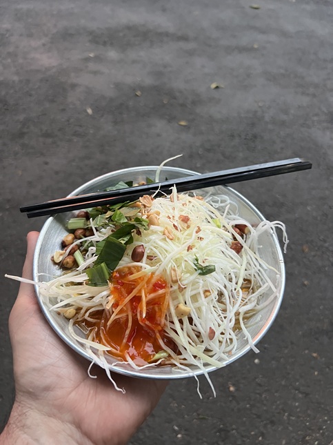 155) Scooter Food Tour, Sài Gòn, Vietnam, February 26, 2025 - Our first stop on our food tour was just a block from our hotel where a man from the Mekong Delta was selling fresh coconut water drinks. He had dried pineapple and dried kumquat. His drink consisted of some dried fruit, some coconut flesh, coconut water and ice. Very refreshing! Next up we got to surprise our guides. They brought us to the park across from our hotel to get papaya salad from a small food cart run by a family that had been operating this cart for five generations. They were shocked when Jonna said she’d just had that salad for lunch and asked her how she’d found out about it. Jonna obviously loves it and it gave me a chance to try it so stop #2 was another success.