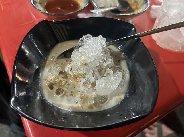 164) Scooter Food Tour, Sài Gòn, Vietnam, February 26, 2025 - Finally, it was time for desert. This was a dish with some heavy French influence. A caramel custard (aka flan) covered with a sauce made from coffee, coconut milk and crushed ice. Another delicious dish and since it was the last one of the tour I went ahead and ate the whole thing.
