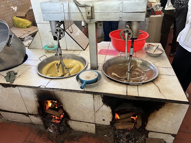 171) Con Phung (Phoenix Islet), Bến Tre, Vietnam, February 27, 2025 - Anyway, after Unicorn Island it was a short ferry down river to Coconut Island. This is a larger island which is accessible via bridge so there is a largish town. Where the ferry drops off there is a market with a demonstration area showing the manufacture of coconut candy. A quick presentation on de-husking, harvesting the flesh and then cooking the flesh to make a sweet treat. Next was the now predicable free sampler and then the table with bags of candy for sale.