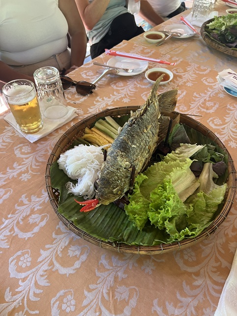 175) Con Phung (Phoenix Islet), Bến Tre, Vietnam, February 27, 2025 - There were three vegetarians in our tour group so we often got platters of food just for us. Here are the vegetarian spring rolls and the banana flower fritters. At least I got my recommended daily serving of fried food!