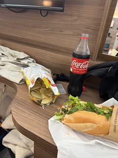 151) Sài Gòn, Vietnam, February 26, 2025 - Our walking tour ended at the Ben Thanh Market. At that point we started a slow walk back to the hotel with a couple of stops along the way to take a deeper look at a few things we'd seen on the tour. Once we got back to the hotel we could check into our room which meant we could change to dry clothes after two hour in the hot Ho Chi Minh City weather. We found a couple of different spots nearby with good looking food. We went back out with Jonna going one direction to get papaya salad and me going a different direction to pick up a vegan Banh Mi sandwich (along with chips and a soda at a nearby convenience store.) We met back up at the room to enjoy our lunch. Yummy and once again we were amazed that lunch for both of us was under $5 total.