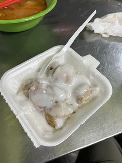 161) Scooter Food Tour, Sài Gòn, Vietnam, February 26, 2025 - Our next stop was our final one. However, we would be trying dishes from multiple vendors so there was still plenty of food to go. We rode to the flower market which operates 24 hours a day. As a result there are lots of food vendors here selling to all the people working and visiting the market. We found a little table - really a knee high crate with tiny plastic stools for chairs. More of a squat than a sit. Our first dish here was split: I had fried quail eggs with cheese, spring onion and crunchy fried shallots, dipped into a tamarind sauce. Very rich and creamy!