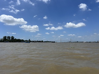 184) Sông Sài Gòn Waterbus, Sài Gòn, Vietnam, March 1, 2025 - The first day of our new tour was primarily about logistics so not a lot to share. We got up early and had breakfast at the hotel. Then we packed up our luggage and checked out of our room. We stored our bags in the hotel luggage room to be picked up in the afternoon. Then we were off to do one sightseeing activity before our tour schedule dominated the rest of the day. The weather is Saigon is always warm and even at 9am that was true. We knew the temperature would be going up as the sun got higher in the sky so doing our outing in the morning would spare us the worst of the heat. It was a thirty minute walk, at a brisk pace, to go the 1 1/2 miles from our hotel to the Saigon River. There are fancy sightseeing boat trips you can do on the river but a traveler’s tip we read in a travel book is the Saigon Waterbus. The government introduced this about 10 years ago to try to ease traffic. It is a commuter ferry that travels along the Saigon River with a dozen stops along the way. A one-way ticket costs 15,000 Dong ($.60) and the trip takes about an hour with boats leaving the main pier every 90 minutes. As a bonus there is a Starbucks at the pier so we could get some decent tea while we waited for the 9:30am boat. The ride was mellow with some nice views of the city skyline and it was interesting to see the other river traffic as freighters and barges sailed past.