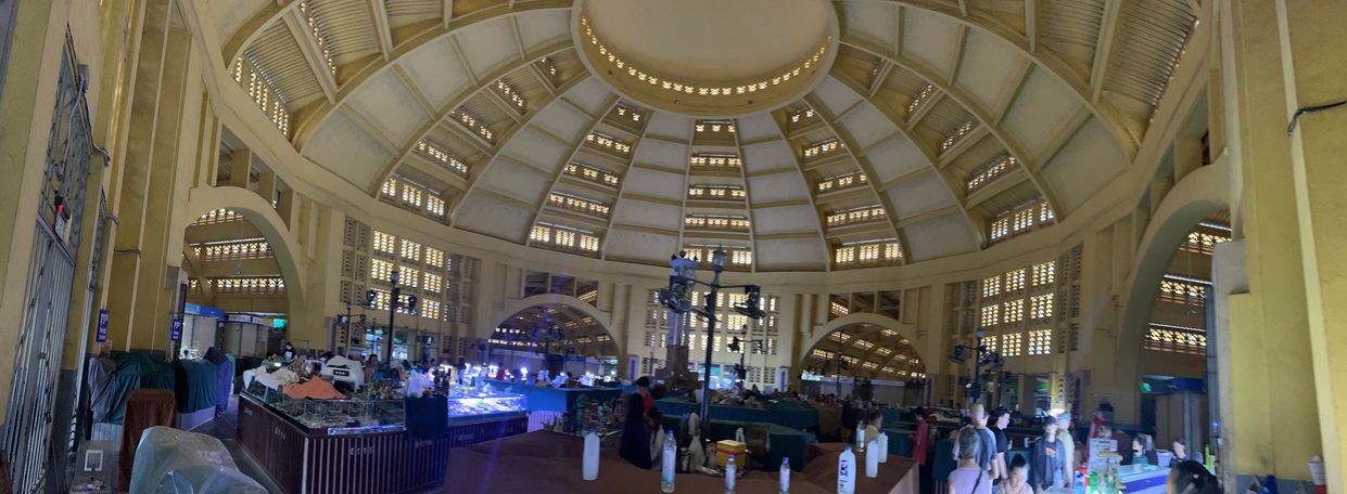218) Tuk-Tuk Tour, Battambang Central Market, Battambang, Cambodia, March 4, 2025 - This was a two hour tuk-tuk tour of Battambang. Traffic was nearly at a standstill as kids leaving school and people getting off work clogged the road beside the Sangker River. It took a little while but we eventually made it to Psar Nat - the Central Market. This was another French building (the French basically forcibly moved the traditional open air markets into enclosed European style markets) built in the 1930s. It had not been as well maintained as the one in Phnom Penh and looked pretty run down from the outside. Nonetheless, it still functions so we walked through to see it. Along the way we got to taste some traditional Cambodian foods - a desert made from coconut milk, palm sugar, tapioca, and lotus seeds.