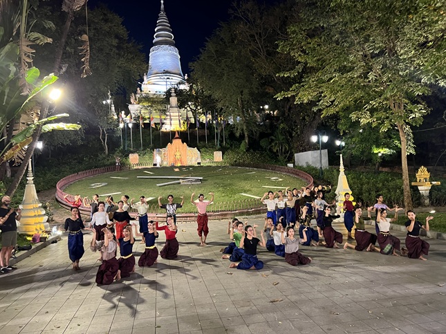 196) Tuk-Tuk Tour, Wat Phnom Daun Penh (Mountain Pagoda), Phnom Penh, Cambodia, March 2, 2025 - In the park below the main temple we saw a big group of young women doing traditional dance so we headed over to investigate. It turns out that a documentary about Cambodian culture is being shot at the temples near Siem Reap in a few days and this dance troupe was rehearsing. We watched them go through their dance a couple of times, then thanked them for letting us spectate. The young ladies were all very cheerful and thanked us for the applause.
