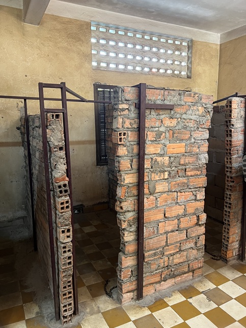 204) Tuol Sleng Genocide Museum, Phnom Penh, Cambodia, March 3, 2025 - This building was used for female prisoners. Each of these brick boxes housed a prisoner who was chained to a bar along the floor of each cell. There was no door and guards patroled the hallways. Truly degrading conditions.