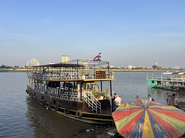 210) Mekong River Cruise, Phnom Penh, Cambodia, March 3, 2025 - At 5pm our group collected in the lobby for our evening outing - a sunset cruise on the Mekong River. A group of tuk-tuks took our group through the city to the riverside. We boarded a private double deck boat which immediately pulled away from the bank and started a slow cruise downriver giving us a nice view of the city skyline. We also got to see river freighters carrying loads downstream, fishermen pulling in their lines or putting out their nets, the constant stream of ferries bring people into Phnom Penh from the other side of the river and all the other sunset cruise boats cruising along the banks. As the sun set the sky lit up but so did the skyline. Many of the buildings were lit up with colorful lights: Temples had spot lights illuminating their golden spires, skyscrapers with massive screens showed giant videos and boats turned on flashing LEDs that reflected off the water.