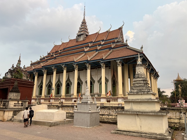 222) Tuk-Tuk Tour, Damrey Sor Pagoda, Battambang, Cambodia, March 4, 2025 - Next we walked into the Damrey Sor Pagoda complex where we got to visit the main shrine. This Buddhist temple was built in the 1890s and shows architectural and artist influences from Europe, Thailand and Cambodia. It would normally be closed by the time we arrived but a very kind caretaker opened it up so we could look around.