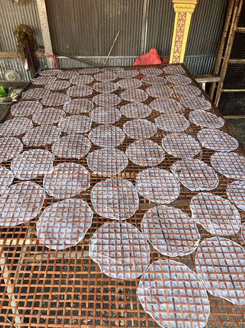 230) Rice Paper Shop, Bicycle Tour, Battambang, Cambodia, March 5, 2025 - As with the potter we saw the previous day this involves a lot of work for low pay. On a warm, sunny day the family can make about 2,200 individual pieces. These are then bundled into packets of 100 which then sell for $3. If the day is rainy or cloudy they can’t produce so income dries up (excuse the pun) because they can’t air dry their rice paper. We got to learn about the entire process and to watch them crank out about a hundred while we were there. A really fascinating view into the small business that is behind something that is so ubiquitous in the culture.
