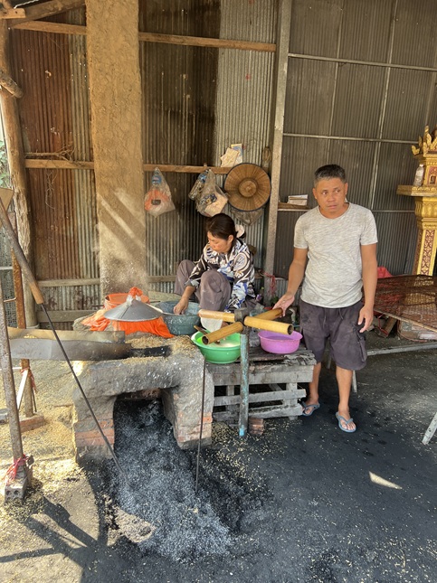 229) Rice Paper Shop, Bicycle Tour, Battambang, Cambodia, March 5, 2025 - The first three miles of the ride got off to a great start. The saffron robed monks from the local temples were out with their begging bowls going from home to home collecting food. Farmers were out tending to their fields and orchards. Street vendors were hawking their products from carts and small store fronts. Home carers were sweeping their walkways and pouring water onto the street in front of their houses to keep down the dust. As we got out of town the temperature was warm and rising with the sun beating down from a mostly cloudless sky. Our first stop was a small house and front workspace made from corrugated metal and brick. Central to the workspace was a wood burning stove with two pots on top. The stove was loaded from the top with a large funnel dumping dried rice husks in to keep the fire burning. The two pots contained boiling water which had cloth stretched over their tops. The woman who runs the house was spooning out a watery rice paste on the cloth and then putting a lid over it for about 30 seconds to stream this rice mixture into a round rice paper. Each rice paper is lifted off the cloth and draped over a bamboo tube on a rotating frame. The woman’s husband then pulled the tube off the rack and rolled the steamed paper onto a drying rack made of woven bamboo slats. These drying racks are then put out in the sunshine to harden the paper into the dry rice paper that people purchase to make food items like fresh spring rolls or wrapping around multiple cooked items that need to be dipped in sauces when served.
