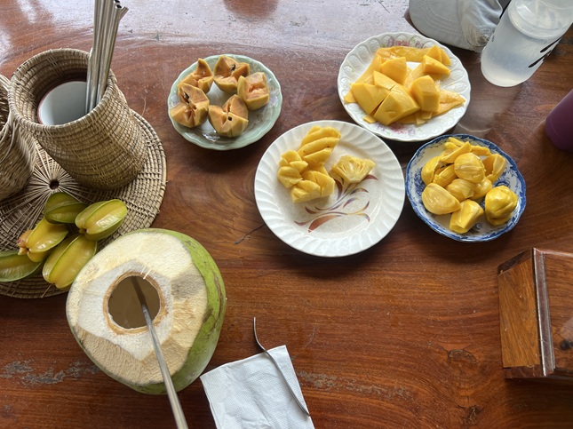 234) Fruit Orchard, Bicycle Tour, Battambang, Cambodia, March 5, 2025 - We stopped at a big, beautiful wooden stilt house. The family that lives here grows and sells various fruits. We learned about the history of the family and then were served samples of four different fruits. Thankfully, this was all set up in the shade underneath the stilt house! The mango was outstanding. There was also pineapple, sapodilla and jack fruit. All delicious and I ate enough of the fruit samples that I wouldn’t need lunch!
