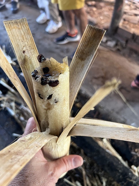 238) Sticky Rice Vendor, Bicycle Tour, Battambang, Cambodia, March 5, 2025 - From there it was another short pedal to our final stop - a roadside shack with long, narrow fire pit down the middle. The lady that owns this business makes sticky rice. She puts a mixture of rice paste, coconut milk, palm sugar and mung beans into bamboo tubes which are then cooked while propped over the narrow fire pit. Once cooked the bamboo tubes are shaved down to a thin tube which are purchased as a snack on the go. Each tube costs about $1 and she starts making them at 3am each day so farmers, business people and school kids can buy them early in the morning. She had a few left when we arrived at 10am but she usually sells out by noon. Finally, we were back on the bikes for the last 5km back into Battambang. I am not gonna lie, this last bit was brutal. By the time we got back to the hotel it was 95 degrees with 53% humidity and that temp was rocketing upwards. Pedaling back in traffic and with the sun blasting us was bordering on miserable. Over the course of the ride I drank four bottles of water but sweated all of it out. When we got back to the hotel room I had a very satisfying shower and then collapsed onto the bed.