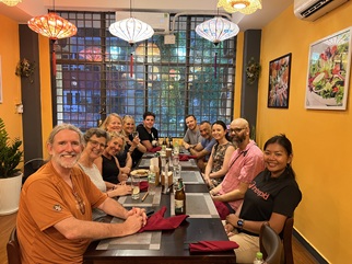 186) Ben Thanh Ward, Sài Gòn, Vietnam, March 1, 2025 - After lunch we hustled back to the hotel where we retrieved our luggage and had a final meet-up with our now ex-guide Minh as he booked our cab to the new hotel where our Cambodia tour would start. It was a quick 15 minute cab ride - out first in one of the Vietnamese Vinfast electric cars - and then a quick check-in for our room. We rested for about 30 minutes then went out to find a Post Office to mail the last of our postcards from Vietnam. Then it was back again to rest for another short bit and then back down to the lobby for the Welcome meeting for the Cambodia group. We met Borey, the Cambodian guide we’ll spend the next week with, and the 14 people we’ll be sharing this tour with - a mix from Australia, the UK, Canada and the US. Two of the people from our Vietnam tour are also on this one so at least us introverts have a couple of people we can hang out with from the beginning. The meeting lasted an hour while we went over the various details of the visas required to leave Vietnam and to enter Cambodia. We also got the itinerary and the emergency contact info. With all the logistics reviewed most of us then went out for a group dinner which was a very nice way to meet some of the fellow tour participants. Now we are back at the hotel to get some sleep to prep for our very early and very long bus trip (on a public bus) from Ho Chi Minh City to Phnom Penh. In the good news/bad news department the bed is very comfortable but our room overlooks a very busy street (with a lot of curious businesses with names like "Lucky Massage Spa", "Happy Inn Hotel" and "Passion Suites Hotel" so ear plugs will be a requirement to get to sleep early on a Saturday night.