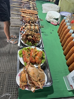 191) Tuk-Tuk Tour, Phsar Thum Thmei (Central Market), Phnom Penh, Cambodia, March 2, 2025 - In addition to the packaged good, there was also prepared food available including seafood from the coast.