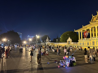 198) Tuk-Tuk Tour, Royal Palace Park, Phnom Penh, Cambodia, March 2, 2025 - One thing that stood out in Independence Park is how Cambodians come out at night to enjoy large communal spaces. There were kids playing soccer, families having picnics, young adults strolling in little groups, tuk-tuk drivers lolling about chatting. It is so intensely hot during the day that the cool of the evening is when people socialize. Then we got back in the tuk-tuks for the final leg of our tour - to the Royal Palace Park. As the name suggests this is a large park directly in front of the Royal Palace where the current King lives (Note: the King is ceremonial in nature, like the Royal family in England. Political power rests with a democratically elected Prime Minister who is always from the dominant Communist Party - though technically there are something like 16 other small parties which play minor roles in politics.) The roads in front of the Royal Palace are closed to motorized traffic every evening and the second tier roads around the park are closed on weekends so tonight it was a big pedestrian place that was lovely to walk around in. Thousands of people out strolling with lots of polite laughter and singing and lively conversation. All while colorful lights and little children’s toys and tiny dogs and kids on bicycles (or miniature electric cars) zoomed around. The most obvious feeling is how much smaller Phnom Penh is than Hanoi and Ho Chi Minh City. HCMC is around 13.1 million people. All of Cambodia is 16 million and Phnom Penh is around 3.5 million. Big by the standards of most US cities but spacious compared to Vietnam. And the people are quite happy - some surveys rank Cambodians in the top of the happiest people in the world. So the atmosphere was really light and friendly. (That said, guide books warn that minor crime like purse snatching, pick pocketing and money scams are common so happy or otherwise we still kept a firm hand on our bags.) We walked the length of the park and then found a restaurant that could accommodate all 16 in our party. The food was good and while it was expensive compared to Vietnam it was still cheap by US standards. I had a vegetarian version of the national dish and Jonna had a papaya salad. Add a bottle of water for Jonna and a fruit smoothie for me. The total was $17.75. Oh, and the total was in US Dollars because Cambodia is dual currency. The official currency is the Khmer Riel but most prices are listed in US dollars since that is the preferred currency. We celebrated the birthday of one of our tour members but the called it an early night when the table next to us fired up the karaoke machine. Four of us walked to the edge of the pedestrian mall and found a tuk-tuk driver who said he’d bring us to the hotel for $3. But once we started driving it became clear that a) he was drunk and b) he had no idea where our hotel was. Jonna managed to use Google maps to navigate him in the right direction from the back and once we got close we had him drop us off. We walked the rest of the way and chalked it up to a travel adventure.