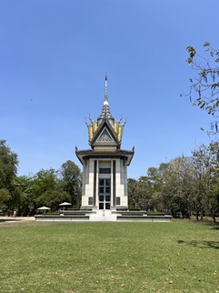207) Choeung Ek Genocidal Center, Phnom Penh, Cambodia, March 3, 2025 - It is estimated that about 20,000 people were killed and buried at this site. The entire field is filled with burial pits but only about half the site has been excavated. The remains of 8,895 were found at that time but bones, clothing, personal items and killing tools continue to be found after rain storms or as walking paths within the site wear down the ground. We saw a few different places where these items have been collected as they are found. Pieces of clothing were visible sticking up out of the dried mud at various places as we walked through the site. It is raw and sickening to experience. A few of the pits have been fenced off and have descriptions to help understand what you are seeing but at any point you look across the field and can see all the undulations that indicate just how many mass graves are at this site.