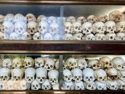 209) Choeung Ek Genocidal Center, Phnom Penh, Cambodia, March 3, 2025 - Finally, we visited the memorial stupa in the center of the site which has glass sides where the bones that have been found here are interned. Seeing row after row of skulls - thousands of them - is overwhelming. After 1 1/2 hours at the Killing Field we re-boarded the bus in an even more somber mood than earlier. As the (air conditioned!) bus drove us back to Phnom Penh both the day tour guide and our Intrepid tour discussed how the lives of their families had been impacted. Beyond the killing they also told stories of the forced marriages, the impact of destroying education and medical systems, and the effects of the famine. Everyone in Cambodia in the 1970s and 1980s were affected. Back in Phnom Penh our guided turned our attention to modern Cambodia: How happy people are now. How Cambodia is pushing forward trying to improve economically. How Cambodians are trying to find new ways to define themselves based on the glory of their Angkor history instead of the atrocities of the Khmer Rouge. I can’t say I cheered up completely but at least I quit dwelling on man’s inhumanity to our fellow man. We had lunch at a tourist restaurant - $17.50 for a two meals and two drinks. By mid-day it was warmer and drier than it had been yesterday. At 12:30pm it was 93 degrees F with 50% humidity. After eating on a shaded outdoor patio we were happy to again sit in an air-conditioned bus for the return to the hotel. Jonna and I formulated a plan to go out in the afternoon to visit the National History Museum but once we were back in the cool hotel room we lost our motivation. Instead we chose to nap, relax and think about what we'd experienced that day.