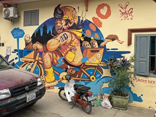 220) Tuk-Tuk Tour, Pub Street Murals, Battambang, Cambodia, March 4, 2025 - On the other side of the market we got back in the tuk-tuks and made a drive down a street, Pub Street, that was decorated with murals back in 2023. We stopped at some of them to learn the messages in the murals.