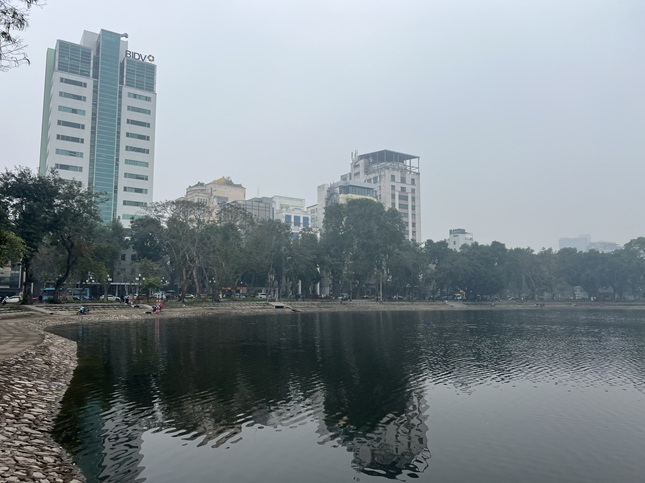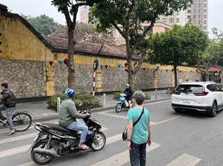 2) P. Quang Trung, Hanoi, Vietnam, February 12, 2025 - Next we cast our sight further afield with a 30 minute walk to Hoàn Kiém Lake – the center of Old Hanoi. Along the way we got a sense of Hanoi – sidewalks packed with parked scooters and pop-up food stalls. Every stop light was a drag race start for dozens of scooters, many loaded down with a family of four or stacked high with goods. Cars squeeze three wide on a road marked for two lanes. Old men in military uniforms patrol the streets and young people walk blindly through traffic with their eyes firmly fixed on their cell phones. Red and yellow flags fly in front of every building and murals of "Uncle Ho" look down every few blocks. The air pollution makes your eyes sting and, despite lots of shop owners sweeping in front of their stores, every walking surface is covered in things you’d rather not think about. Tet, aka New Year, just passed and there were flowers bursting out in all the parks – peach blossoms and roses and chrysanthemums were everywhere.