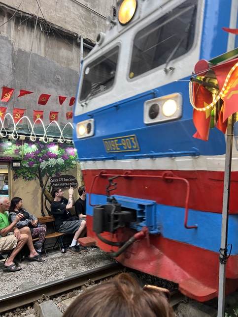 13) Train Street, Hanoi, Vietnam, February 12, 2025 - After the prison we took a looping route back towards the hotel in order to see another unique Hanoi tourist site. Train Street is a narrow, block long alley with train tracks running down the middle of it. On either side of the tracks are rows of chairs or tiny two seat tables. Twice a day the passenger train from the north of the country rolls through literally brushing the knees of those seated along Train Street. We arrived 10 minutes before the scheduled arrival and got a table (for the price of two cold drinks – about $2.50) The Vietnamese train service is clearly not run by the Germans or the Japanese. Punctuality isn’t their strong point. About 30 minutes after the scheduled time a big old train thundered through at about 30 mph. How this happens twice a day without gore and mayhem is beyond me. It must be a train geek’s idea of heaven though because you literally can’t get closer to a train and not be squashed. After that memorable experience we finished our walk back to the hotel to rest for a bit.