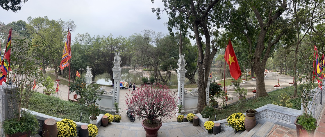 31) Đền Núi Sưa, Hồ Tròn Bách Thảo (Hanoi Botanical Garden), Hanoi, Vietnam, February 13, 2025 - After spending about three hours in the complex we were ready to sit for a bit so we found the nearest coffee shop where we could sit, people watch and caffeine up. It turned out to be a lousy café but at least we got to rest our feet for a bit. It was also interesting to see one unique aspect of this part of Hanoi – the traffic. The roads are generally a pretty chaotic place in Hanoi with bicycles, pedicabs, scooters, cars, vans and buses all making their own way regardless of what lines are painted on the roads or what the traffic lights are doing. However, on the roads around the Complex where there are hundreds of military and police the roads suddenly become very orderly. Everyone stops when lights change, stay strictly in the lanes, only drive in the direction of the traffic around them and drastically reduce the use of their horns. I can only imagine what this would look like from above – like there is a magic force field around the mausoleum that causes an unpredictable cloud of movement to suddenly become orderly. After our coffee break, now buzzing from the high octane brew, we walked over to the Bách Tháo botanical garden. This rather rundown park was a sad version of an urban garden with some even sadder bird enclosures, some under-used workout equipment, a few varieties of trees and a messy pond inside. There was a small temple that was interesting and brightly decorated with fresh flowers.