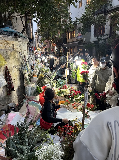 44) P. Hồ Xuân Hương Street Flower Market, Vietnam, February 14, 2025 - Once she returned we ate our salads but then discovered we were running out of bottled water. Despite it being after dark now we rallied and went out to find a shop Jonna had spotted on her way to get the foot massage. The evening was the perfect temperature so we picked an indirect route back to the hotel. On the way we ran across an impromptu flower market selling roses and flower arrangements for Valentine’s Day. A small group of ladies with folding tables on the sidewalk with another woman ferrying in bundles of fresh flowers on a scooter to keep them supplied. Men were pushing in four deep to buy flowers for their Valentine and the street was mostly blocked by all then scooters and bicycles belonging to the desperate paramours. It was a fantastic thing to stumble upon and inspired us to walk around a little more. We dropped off the water in the room and headed right back out. We hadn’t spent much time exploring the neighborhood to the southwest of our hotel nor had we ventured into the big park directly west. These areas were perfect to explore - a section of Hanoi where the locals shop and eat - we didn’t see a single non-Asian the entire time. There were old men drinking beer in "fresh beer" bars - really just plastic tables on the sidewalk. Young people were going in and out of clothes shops. A friendly woman recommended her favorite popcorn snacks at a colorful store advertising "healthy American snack". However, the best was when we went into the park. Thumping dance music drew us to an area where about 40 women were doing a dance workout class - all wearing colorful leotards and loudly singing along to the music while a very energetic teacher called out the moves. We made a loop through maybe a quarter of the park and I felt completely safe. There were joggers and people out walking their dogs and a couple of LED light covered carousels giving kids rides in miniature race cars and a choo-choo train. A very fun, spontaneous stroll through the neighborhood and a fine way to end our day.