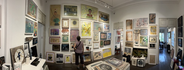 50) Manzi Art Space and Cafe, Hanoi, Vietnam, February 15, 2025 - Now that we were back on the edge of the old center of Hanoi we struck out on foot again once we were done at the art museum. It was time for lunch and Jonna found a place with both vegetarian and meat options though it was in the heart of tourist hell at Hoàn Kiém Lake. We had to walk for about 30 minutes to get there but we found another interesting street so it was a good walk. This area was filled shops selling children’s toys. I mean block after block with dozens of shops on either side of the street just packed floor to ceiling with toys. Dolls, trucks, Spiderman accessories, stuffies, plastic AK47s, etc. There were individual shops dedicated to just stuffed animals crammed so full looking in the door was like peering into a claustrophobic furry cave with walls that were pink and lime green and baby blue. I bet there are stuffed animals from 20 years ago buried in some of these shops that no one even remembers existed. Most of the toys are close-but-not-quite copies of name brand images - usually of Japanese anime or kid's shows. Still the sheer number of them was staggering. We think that weekends are when families, maybe even families from the rural areas, load up and come to this area to buy toys for their kids so for four or five blocks there are hundreds of vendors showing off their goods hoping to catch the eye of an insistent kid. After walking all the way to Hoàn Kiém Lake we found our restaurant. And it was an actual restaurant with actual tables and chairs. This was the first restaurant we’ve been in since arriving in Hanoi. And after highlighting the cheap street food over the past few days we were suddenly acting like ballers by paying the big bucks to eat at a real table and in the center of the tourist area as well. We ended paying an extravagant $6 for two meals and a soda, double what we’ve paid for any previous meal. With us throwing around this kind of money we might as well start buying those "totally authentic" Gucci, Adidas and The North Face clothes we keep seeing in all the shops. With lunch literally under our belts it was time for some more walking. We had read in a guide book about a cooperative art space up by Long Bien Market about 20 minutes walk north. We again picked a new route which put us walking through a very local neighborhood - no visible tourists and lots of families on the sidewalks. This brought us to the Manzi Art Space and Cafe which is a two-story coffee/tea place that is also a gallery space crammed with art that is for sale. Not only are the walls covered with art from floor to ceiling but every flat surface is stacked multiple layers deep in art and even sections of the floor are filled. It was fun to wind through just looking at the amazing variety. We didn’t buy anything but there were pieces that I think would hold up in any gallery in the US. Just a few blocks to the east of the art cafe was the famous Longmont Bien bridge so we made a quick side trip to see it. Today this is a rusty, boring iron suspension bridge. However, in the 1960s and 1970s it was a veritable symbol of Vietnamese resistance against the US. For two decades the US would send B-52s and F4 Phantoms and F-104s to bomb the bridge. Then, during the night an army of Vietnamese repair crews - many women - would frantically repair the bridge so it would again be operating the next day. It was a huge source of pride for the people of North Vietnam and a powerful propaganda message all throughout the war. It still functions today but it sure looks like it hasn’t had much repair work done on it the past 50 years. Once we had spotted the bridge we both declared we were done for today. The Dong Xuan market was just a block away and that was an easy spot to get a ride-share. We just didn’t have it in us to walk the 4 miles to get to back to the hotel when we’d already racked up nearly 7 miles today. Tired feet are a powerful motivator to pay for a ride. Then again, the total for all three of our ride shares today was $6 so we weren’t breaking the bank on Grab rides. Back at the hotel we rested for an hour but we still had two more things on our schedule. At 4:30pm we headed out for the first - picking up the laundry we dropped off yesterday. It was a quick and easy task but didn’t do much to ease our tired feet. We only lost one sock with laundry so not bad for getting clothes washed in a foreign country. Be the time we got back to the hotel we just had a few minutes to freshen up before the second and more important task - the welcome meeting for the tour we will be joining for the next 15 days to see more of Vietnam. We booked a small group tour with Intrepid Travel and tonight we met the 10 people joining us for the tour and the guide that will be leading us. We got all the paperwork and introductions out of the way, then went as a group to a fancy restaurant for the welcome dinner. After four days of street food this was a drastic change of venue. Fine linen table cloths, fancy china place settings, back lit marble walls and dishes that were a fusion of traditional Vietnamese and gourmet French. For two of us we paid an extravagant $15. We just aren’t fancy restaurant types so for us it was loud, slow, a bit pretentious and actually less tasty than the super cheap and super fast street vendors. Still, it did give us a chance to learn about the people we’ll be with for the next two weeks so it fulfilled the welcome part of the dinner which is what was intended. Now we switch over to following a preset itinerary so time to head to bed so we can be on-time tomorrow.